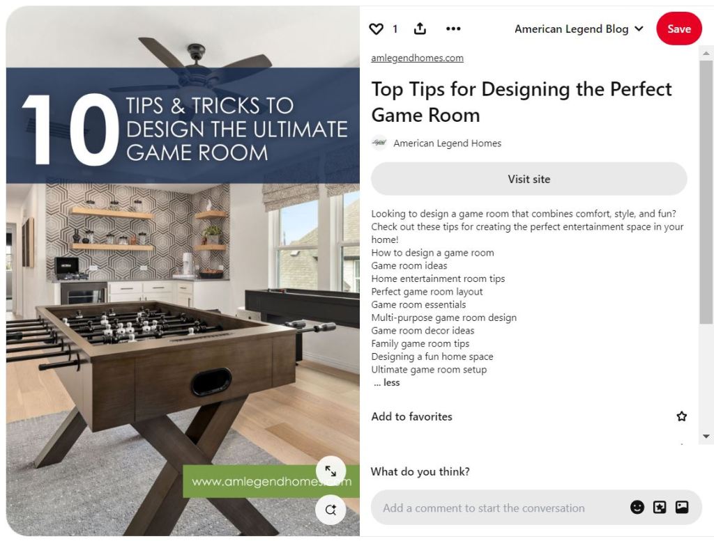 At American Legend Homes, I am in charge of all blog posts on the website. From ideation to copywriting to promoting on social media. Below are a few examples of the blog posts I have written for American Legend Homes along with their respective Pinterest posts.